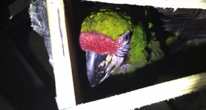 De acuerdo con el boletín, efectivos de la GN decidieron inspeccionar una caja con orificios, en el área de descarga, ya que de ella provenían ruidos extraños. Al abrirla, descubrieron que en su interior se encontraba el ave con plumaje verde, procedente de Guadalajara, Jalisco.