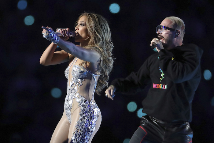 Jennifer Lopez, izquierda, y J Balvin durante su presentación en el espectáculo de medio tiempo. Foto: AP/Gregory Payan