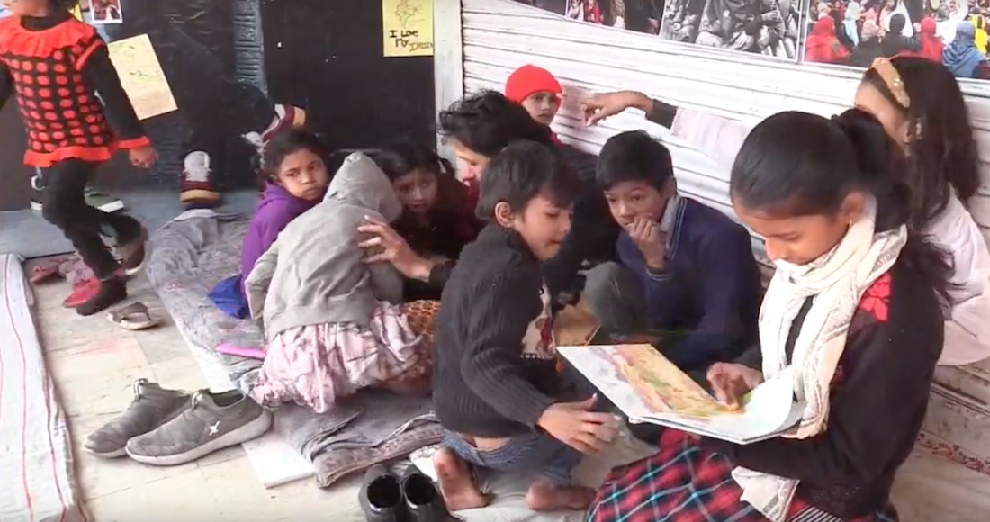 Se trata de una zona estrecha que cuenta con varias colchonetas, una estantería con libros infantiles y decenas de dibujos hechos por los niños que acuden cada día tras salir del colegio, mientras sus madres y abuelas forman parte de la insólita acampada de mujeres que se manifiesta contra la Ley de Ciudadanía en la India.