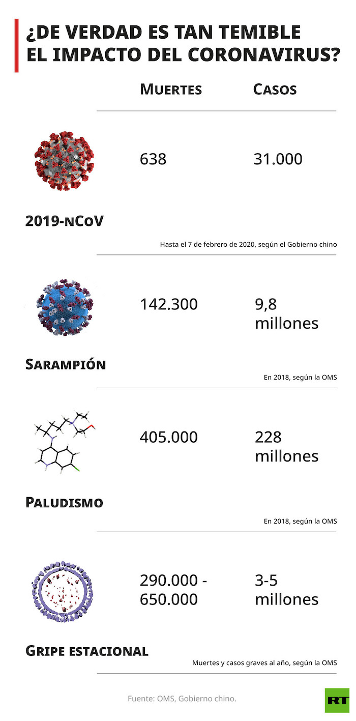 Ciudad de México, 07 de febrero (RT).– Con 638 muertos y más de 31 mil infectados, el brote del nuevo coronavirus 2019-nCoV ha sembrado pánico en la sociedad y en los medios de todo el mundo. Mientras, otras enfermedades, como la gripe estacional, el sarampión o el paludismo, causan decenas de miles de muertes cada año, pero no acaparan tanta atención.