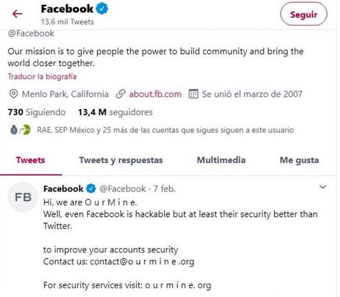 Bueno, incluso Facebook es hackeable, pero su seguridad es mejor que la de Twitter", señalaron en un tuit publicado en varias veces en la cuenta oficial de Facebook.