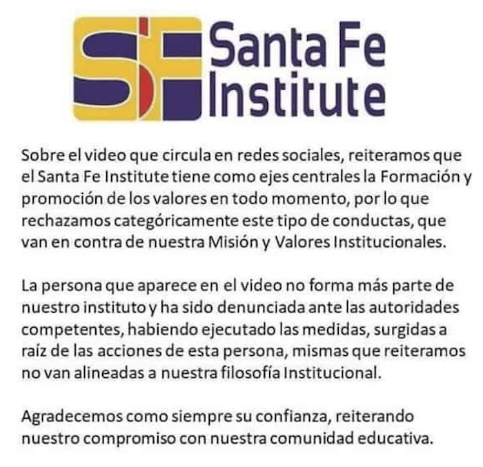 "Sobre el video que circula en redes sociales, reiteramos que el Santa Fe Institute tiene como eje centrales la formación y promoción de los valores en todo momento, por lo que rechazamos categóricamente este tipo de conductas, que van en contra de nuestra Misión y Valores Institucionales", señala el comunicado.