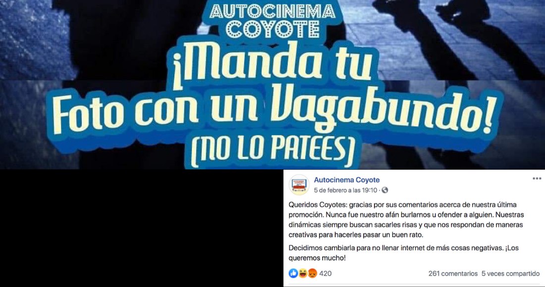 "No, no es broma. Autocinema Coyote pide que te tomes una foto 'CON UN VAGABUNDO', como promoción ?. KHÉ?! Lamentable, inadmisible ?", posteó la periodista Patricia Peñaloza.