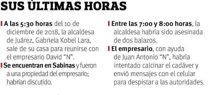 De acuerdo con la cronología oficial del caso, el día que la Alcaldesa falleció fue el 10 de diciembre del 2018. A las 05:30 de la mañana se encontró con David “N” para sostener una charla sobre un adeudo de la empresa con las arcas del municipio de Juárez, y posterior a una discusión sobre el tema la Edil fue asesinada.