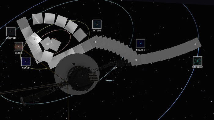 Una ilustración del artista muestra dónde estaban la Voyager 1 y los planetas cuando la nave espacial tomó la icónica imagen "Punto azul pálido".