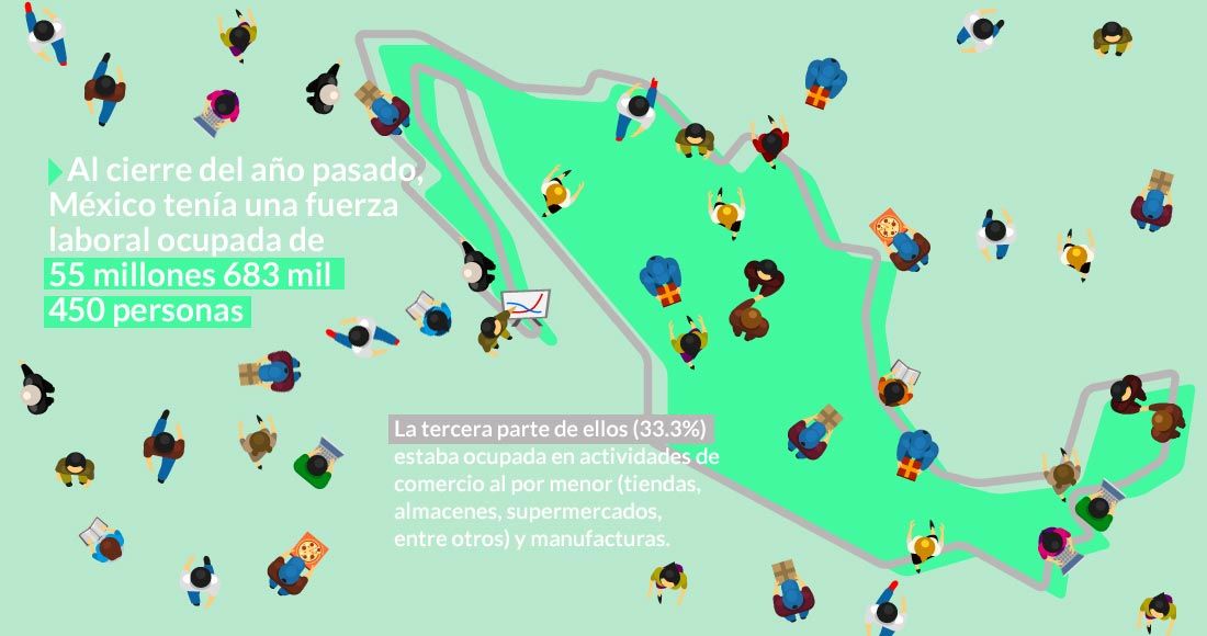 Al cierre del año pasado, México tenía una fuerza laboral ocupada de 55 millones 683 mil 450 personas. La tercera parte de ella (33.3 por ciento) estaba ocupada en actividades de comercio al por menor (tiendas, almacenes, supermercados, entre otros) y manufacturas.
