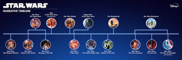 La plataforma ha querido poner al día a aquellos espectadores más ocasionales pero que siguen la saga. La imagen consagra que la trilogía de precuelas, La amenaza fantasma, El ataque de los clones y La venganza de los Sith son las películas que marcan el inicio del timeline de Star Wars, teniendo el segundo y el tercer episodio entre medias la serie The Clone Wars.