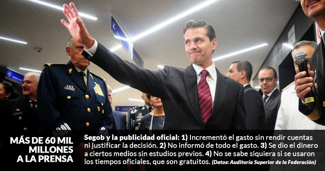 El dinero entregado a medios de comunicación durante la administración de Enrique Peña Nieto ascendió a 60 mil 237 millones de pesos. Año con año organizaciones civiles y periodistas alertaron que la cantidad era por mucho mayor a lo que estaba establecido en el Presupuesto y con el informe más reciente de la ASF queda claro que eso ocurrió y que se hizo sin justificación alguna.