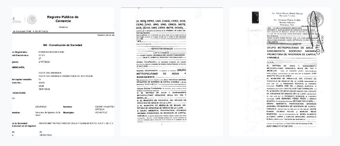 Pero las fechas de la Gaceta Legislativa y el Contrato de Sociedad con el que se constituye la empresa ganadora de la licitación, no coinciden. El acta notarial que consta de la constitución del consorcio Grupo Metropolitano de Agua y Saneamiento S.A.P.I. de C.V. (Grupo MAS), de la que PODER posee una copia, fue firmada el 01 de junio de 2015. Lo anómalo en dicho documento es que una de las empresas firmantes, Grupo Ambiental ProVeracruz, S.A.P.I. de C.V., no existió sino hasta el 10 de junio de ese mismo año, según su acta constitutiva.