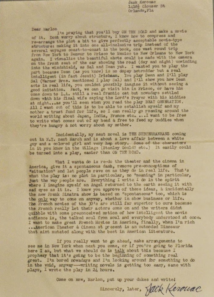 Brando nunca respondió a la carta de Kerouac, pero debe haber pensado lo suficiente en él como para mantenerla archivada entre sus documentos personales. Kerouac también le envió a Brando una copia de su obra The Beat Generation, que el actor también (tristemente) ignoró».