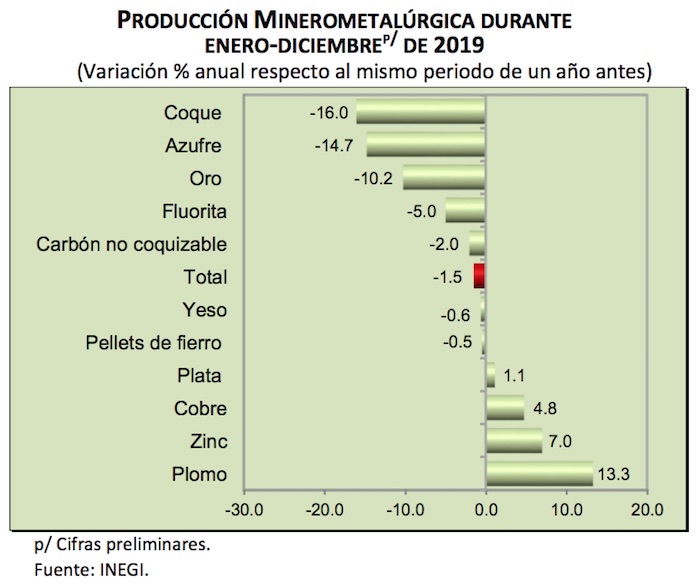 Con cifras el Inegi señala que la producción minerometalúrgica ascendió 0.9 por ciento en el mes en cuestión con relación a la de diciembre de 2018; a su interior, creció la producción de plomo, yeso, zinc, fluorita, plata y la de azufre. Por el contrario, retrocedió la de coque, pellets de fierro, carbón no coquizable, oro y la de cobre.