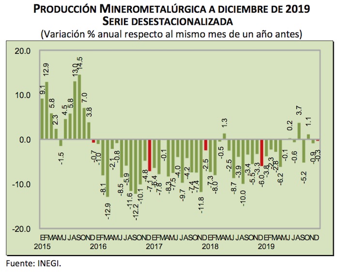 En cifras desestacionalizadas la Producción Minerometalúrgica del país (referida a las actividades de extracción, beneficio, fundición y afinación de minerales metálicos y no metálicos) en su comparación anual, observó una caída de 0.3 por ciento durante diciembre del año pasado respecto al mismo mes de 2018.