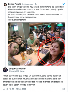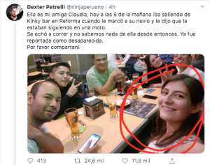 "Se echó a correr y no sabemos nada de ella desde entonces. Ya fue reportada como desaparecida", escribió el usuario @ninjaperuano en Twitter.