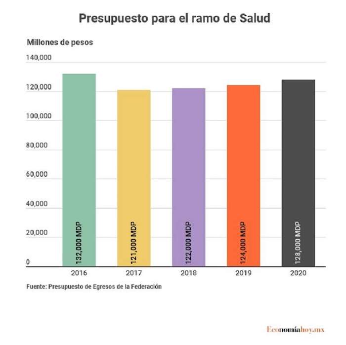 En términos generales el presupuesto de salud para 2020 de 128 mil 826 millones de pesos es 3.6 por ciento superior al del 2019, pero no alcanza el punto más alto de los últimos cinco años, al ser 2.56 por ciento menor que en 2016.