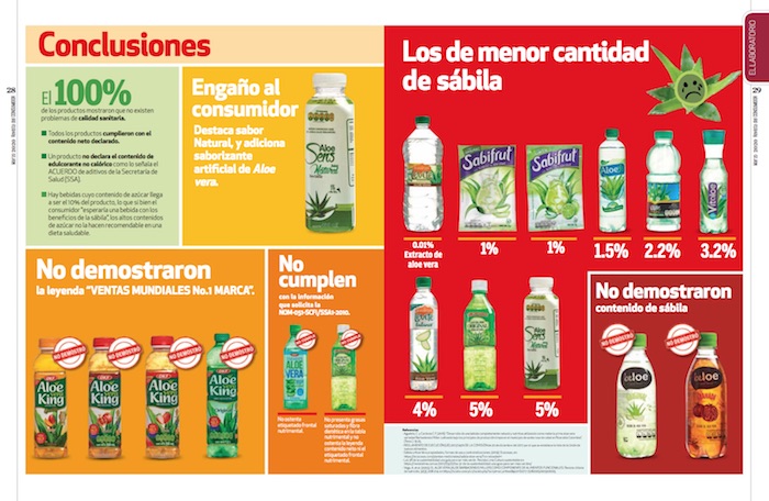 La marca mexicana Vevaloe salió calificada al nivel de las procedentes de Corea del Sur (OKF Aloe vera King y T’best ALOE). OKF Farmer’s Aloe vera, procedente de Corea contiene 20 por ciento del ingrediente y del mismo país, El Mexicano Brand sólo contiene cinco por ciento de Aloe; ambas marcas incumplieron con los requisitos de la NOM-01-5 CFI/SSA1-2010.