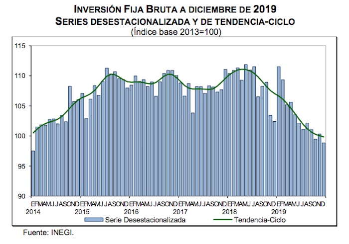 México, 6 de marzo (EFE).- La inversión fija bruta de México cayó 4.9 por ciento en 2019 frente al año anterior debido sobre todo al descenso de la maquinaria y equipo, reportó este viernes el Instituto Nacional de Estadística y Geografía (Inegi).