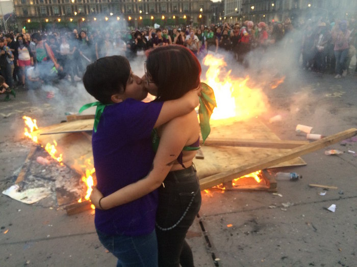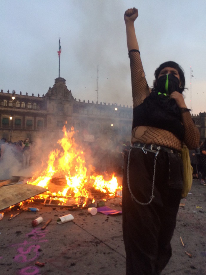 Iluminadas por el fuego, otras ciudadanas lanzaban consignas en contra del Presidente Andrés Manuel López Obrador. "Tiene más interés en rifar boletos que proteger a las mujeres.
