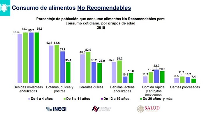 CONCAMIN y CCE repiten los dictados de ConMéxico una y otra vez, entre ellos destaca: el problema es la comida de la calle, las garnachas. La lámina anterior muestra el porcentaje de la población mexicana que consume una serie de alimentos y bebidas no recomendables. Si uno se refiere a la ingesta calórica, la responsabilidad es aún mayor de los llamados alimentos ultraprocesados y las bebidas azucaradas. En promedio, alrededor del 30% de las calorías de los mexicanos vienen de estos productos, esto significa que más de 600 calorías diarias, que en su mayoría son calorías extras, ya que estos productos, en especial las bebidas, no generan saciedad y, al contrario, provocan un mayor consumo.