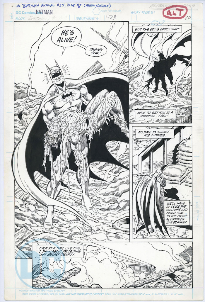 El año pasado, el portal Polygon tuvo acceso a algunos apartes de esa versión de la mano de DC Comics y los publicó esta semana, a puertas del 80 aniversario de la aparición del Chico Maravilla en los cómics, el próximo abril. Se trata de la imagen escaneada de una de las páginas no publicadas en la que Bruce Wayne sostiene a Robin en sus brazos y asegura que sigue con vida, aunque "malherido".
