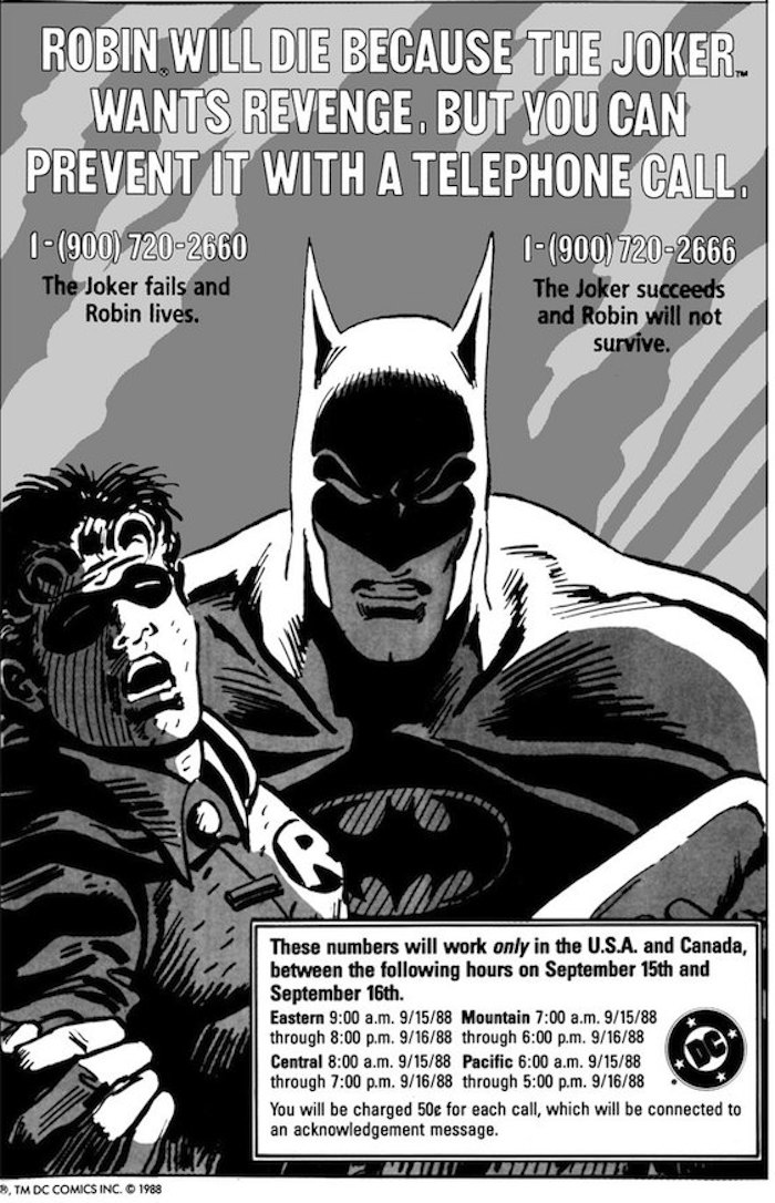 "Robin morirá porque el Joker quiere venganza, pero tú puedes prevenirlo con una llamada", decía la oferta de DC.