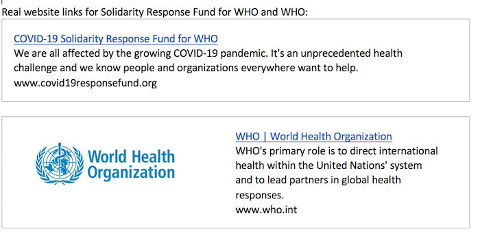 Seguido de la supuesta presentación del fondo, el correo electrónico enfatizó que las donaciones recibidas servirán para recursos básicos y equipo para personal de salud. Además del apoyo internacional para la detección de casos; asegurar la presencia de profesionales de la salud en todas las comunidades y acelerar los esfuerzos para descubrir con rapidez vacunas, diagnósticos y tratamientos.