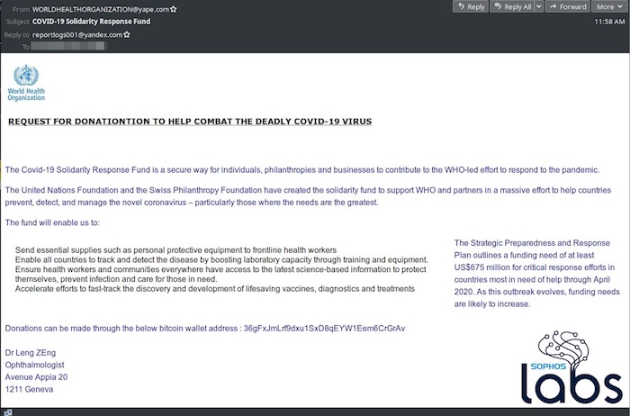 Los delincuentes solicitaron, a quienes ingresaron a la página falsa, el depósito de Bitcoins para contribuir a la mitigación de la pandemia. Chester Wisniewski, experto en ciberseguridad de la empresa Sophos, detectó la amenaza de robo y en un comunicado alertó del delito.