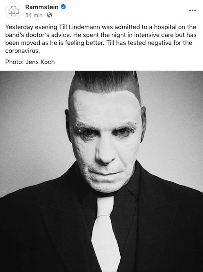 “Till Lindemann fue internado anoche por el médico de la banda en un hospital. Till pasó una noche en cuidados intensivos y hoy lo trasladan a otra estación porque está mejorando. La prueba del virus Corona fue negativa”, se lee en el pequeño comunicado.