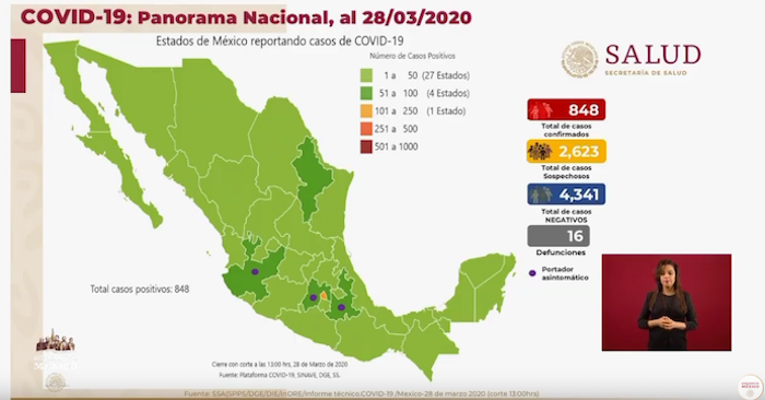 La Secretaría de Salud informó ayer que 16 personas han muerto a causa del COVID-19 en México, lo que representa 131 más que el día anterior, cuando se contabilizaban 717, mientras que hay 848 personas enfermas en todo el país.