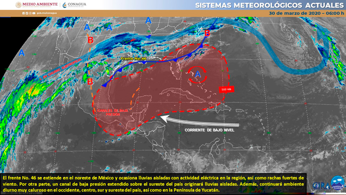 Por su parte, en el norte y noreste de la República se pronostican lluvias aisladas y rachas de viento de 50 a 60 kilómetros por hora con algunas tolvaneras, debido al ingreso de un nuevo frente frío combinado con una masa de aire.