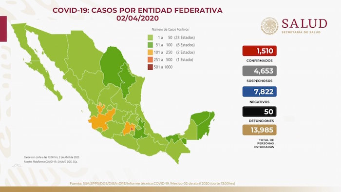 Ciudad de México, 2 de abril (SinEmbargo).– Autoridades de Salud informaron esta noche que 50 personas infectadas con coronavirus han muerto en México. Además, se han confirmado mil 510 casos, se estudian 4 mil 653 como sospechosos y se han descartado 7 mil 822.