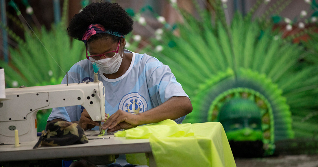 En el taller de Padre Miguel, Jucelia Abreu y sus compañeras pasan la tela por sus máquinas de coser y cortan los hilos. Otros miembros de la escuela de samba hacen lo mismo desde sus casas. En total, el equipo elabora unos 450 trajes al día.