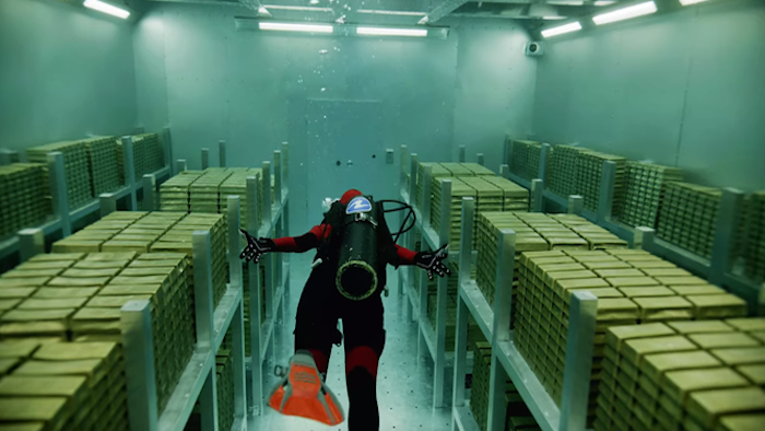 Más complicado lo tuvieron al rodar las escenas acuáticas dentro de la cámara acorazada del Banco de España, pues el material con el que estaban fabricados los falsos lingotes no resistió la presión del agua y tuvo que realizarse un laborioso trabajo de postproducción.