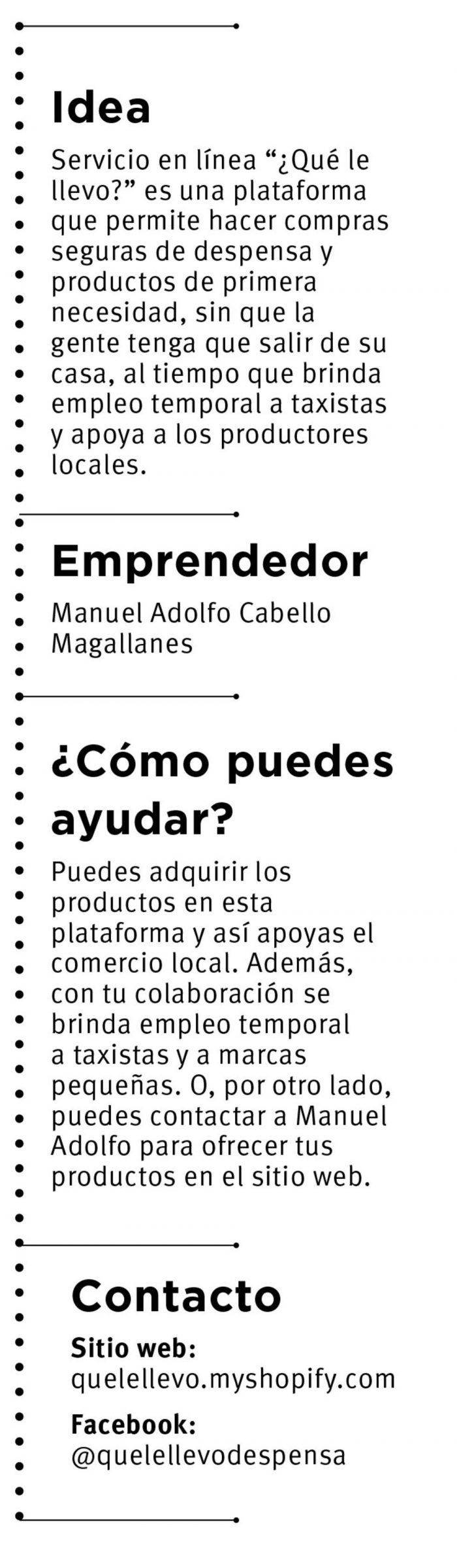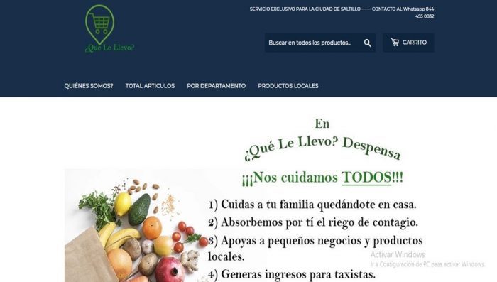 Coahuila, 15 de abril (Vanguardia).- Para los que prefieren no salir de casa y hacer el súper en línea, aquí les presentamos una buena opción. Se trata de la plataforma “¿Qué le llevo?”, creada por Manuel Adolfo Cabello Magallanes y que comparte con Mind in Saltillo como uno de los proyectos para apoyar la economía local en época de contingencia.