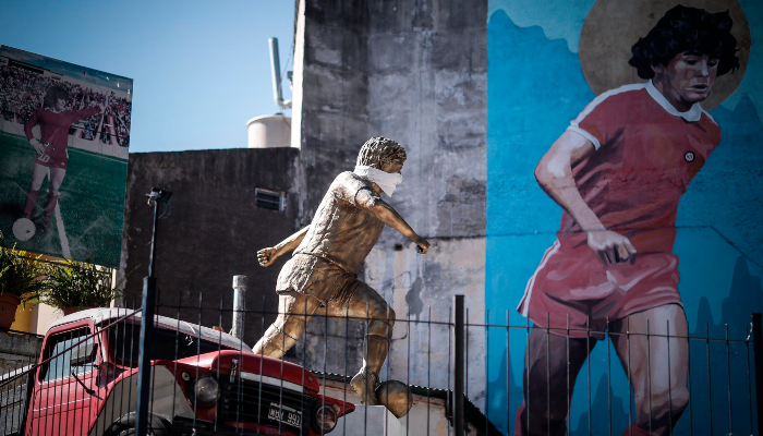 La figura del campeón del mundo en México 1986, que lleva una pelota de futbol pegada a la pierna izquierda y está a pocos metros del estadio Diego Armando Maradona, tiene ahora una mascarilla blanca.