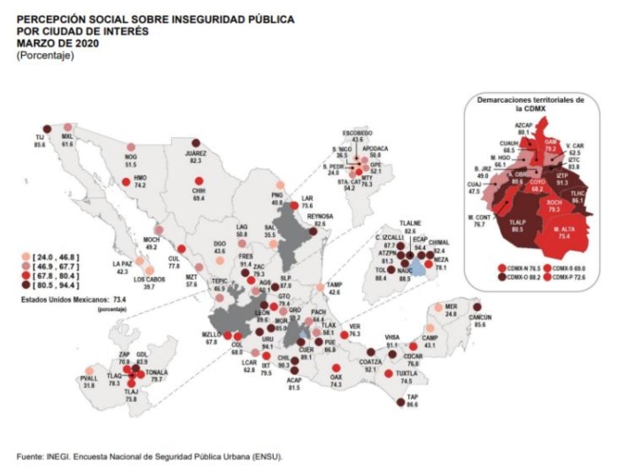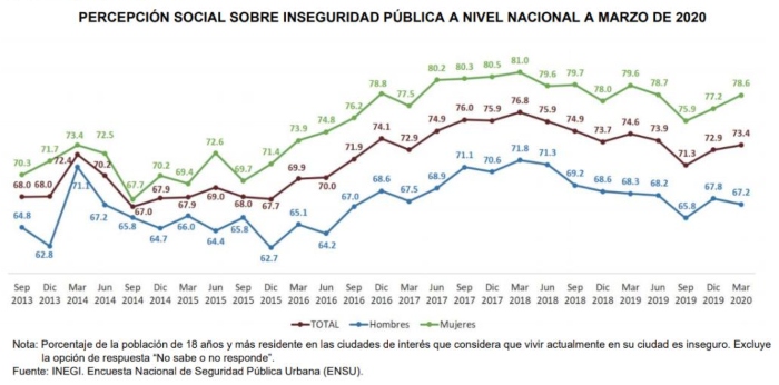 La Encuesta Nacional de Seguridad Pública Urbana del instituto Nacional de Estadística y Geografía (Inegi) dio cuenta que a tasa anual la percepción de inseguridad fue menor 1.2 por ciento. "Este porcentaje no representa un cambio estadísticamente significativo con respecto de diciembre de 2019, en donde se registró un porcentaje de 72.9 por ciento. Sin embargo, representa un nivel estadísticamente menor con respecto de marzo de 2019, en donde se registró un porcentaje de 74.6 por ciento", informó el instituto.