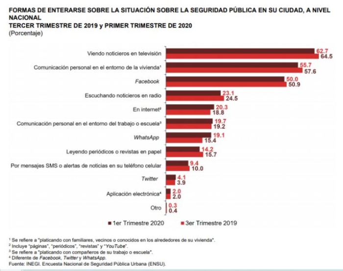 La población mexicana expresó los medios a través de los que se entera de los temas de inseguridad. La mitad de las personas encuestadas expresó que se informa sobre el tema en Facebook; el 19.1 a través de Whatsapp y el 20.3 por medio de internet en páginas, periódicos, revistas y YouTube.