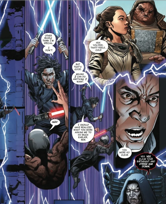 En el clímax de la historia, Ben se enfrenta en un combate a muerte con el Caballero de Ren, y ambos caen por un acantilado, y mientras los sables chocan se puede ver en una de las viñetas a Palpatine en su refugio de Exegol pronunciando exactamente las palabras que Kylo Ren necesita oír para autoconvencerse de que está destinado a seguir los pasos de su abuelo Darth Vader.