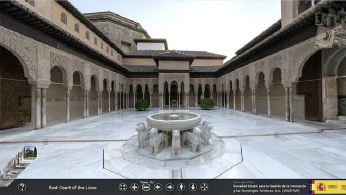 A la Alhambra tienes que ir en persona, eso es indiscutible, pero entre que vas y no puedes conocerla con gran detalle en esta visita virtual. Desde un mapa aéreo tienes acceso a sus diferentes edificios y una vez dentro de ellos podrás moverte de una estancia a otra, a tu aire y a tu ritmo. Sería un delito, por ejemplo, que pasaras por alto los Palacios Nazaríes y el Patio de los Leones.