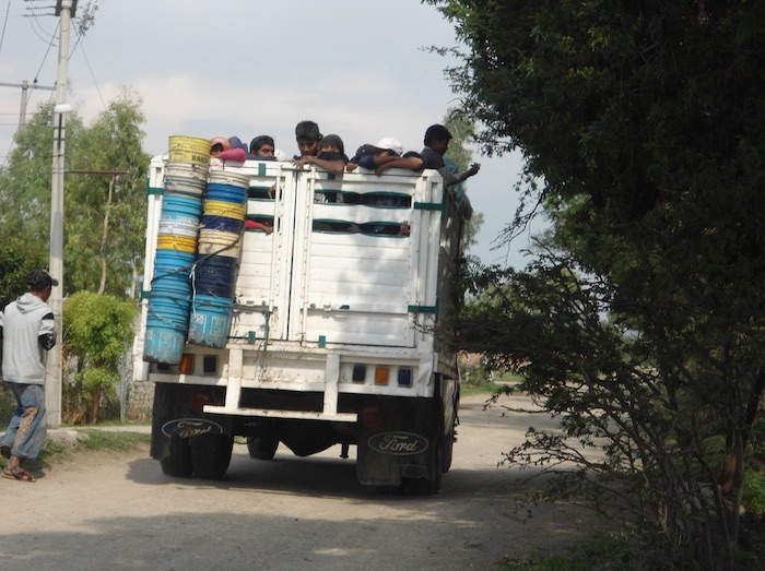 La mayoría de los trabajadores se trasladan en camiones contratados por las empresas. Algunas pueden ser camionetas tipo van o de redilas con capacidad entre 10 o 20 personas, mientras otras de mayor tamaño tipo autobús con capacidad entre 35 y 50 asientos.