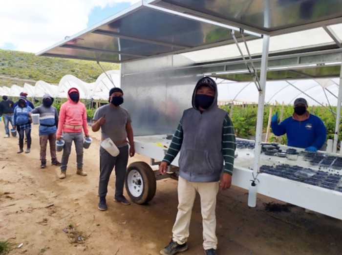 Jornaleros agrícolas con cubrebocas respetan distanciamiento social. Foto: Cortesía de la empresa San Vicente Camalu, en Valle de San Quintín, Baja California, 2020, publicada por el informe del Colef.