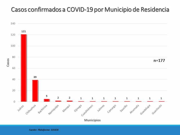 Del total de pacientes, 121 se encuentran en Juárez, 39 en la Ciudad de Chihuahua, cinco en Bachíniva, mientras que Namiquipa y Meoqui cuentan con dos cada uno. Cuauhtémoc, Ojinaga, Julimes, Camargo, Saucillo, Ahumada, Guadalupe y ahora Guachochi, registran un caso.