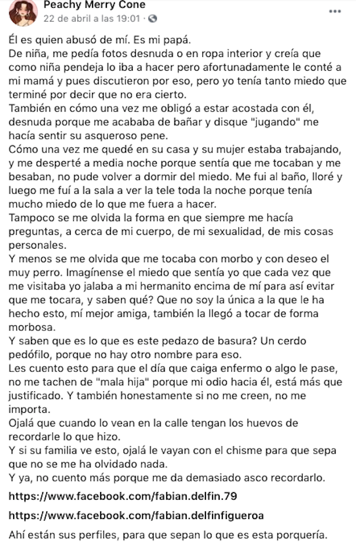 Peachy, como se hace llamar en Facebook, denunció el abuso sexual que sufría por parte de su papá identificado como Fabián. Comenzó a pedirle fotos y a tocarla, ella se armó de valor y se lo dijo a su madre y terminaron discutiendo, tenía tanto miedo que terminó por decir que no era cierto.