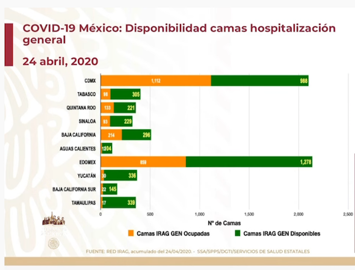 Detalló que no todas las camas disponibles son de terapia intensiva y que los 610 hospitales registrados hasta el momentos forman parte de la Red de Infección Respiratoria Aguda Grave (IRAG), encargada de detectar enfermedades con signos compatibles con neumonía y múltiples agentes infecciosos, esto para investigar si alguno de esos casos corresponden a COVID-19.
