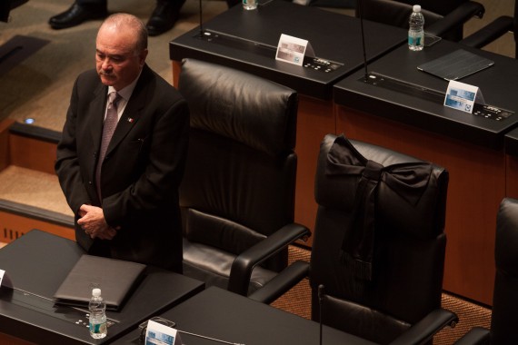 MÃXICO, D.F., 25SEPTIEMBRE2012.- Un moño negro luce en la curul que le perteneciera a Alonso Lujambio, senador del PAN quien murió por la madrugada vÃctima de cancér. En la foto se aprecia al tambien panista Ernesto Rufo.