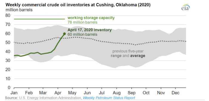 Como resultado de este choque extremo de la demanda, el exceso de volúmenes de petróleo crudo importados y producidos en el país, el almacenamiento se está disparando. Según los datos de capacidad de almacenamiento de la EIA, las instalaciones de almacenamiento de petróleo crudo en Cushing tienen 76 millones de barriles de capacidad de almacenamiento en funcionamiento.
