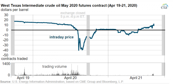 Ciudad de México, 28 de abril (Economía Hoy).- Nueva jornada de volatilidad y drásticas caídas en el mercado de futuros del petróleo West Texas (WTI), de referencia en Estados Unidos. Los movimientos que se vienen observando en las últimas semanas en este mercado no tienen comparación en la historia. Subidas y bajadas del precio del crudo americano del 20 por ciento, con el barril oscilando entre los -40 dólares y los 20 dólares.