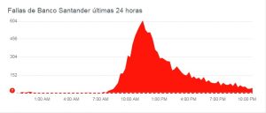 Usuarios de Santander informaron que los servicios de la banca móvil presentaban fallos desde pasadas las 7:00 horas de este viernes, de acuerdo con notificaciones realizadas a través del portal Downdetector. El mayor pico de fallos ocurrió cerca del mediodía.