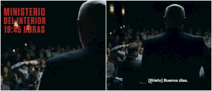 Una discordancia temporal fue lo que pasó con la declaración de Prieto, el coronel del CNI, ante los medios de comunicación sobre la detención ilegal de Río. Según señala en un letrero la propia serie, Prieto comparece en el Ministerio de Interior a las 19:45 horas.