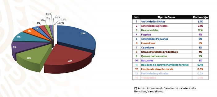 El resto de las causantes es la falta de control en las actividades agrícolas, pecuarias, de caza, así como la irresponsabilidad en fogatas, fumadores, quema de basura y rituales. Solo el 1 por ciento fue por causa natural en ese periodo.