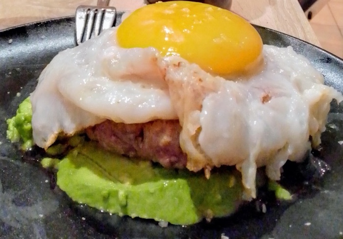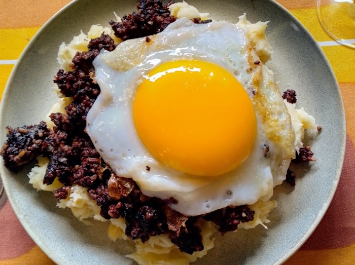 10. Puré de yuca con morcilla, huevo poché y membrillo